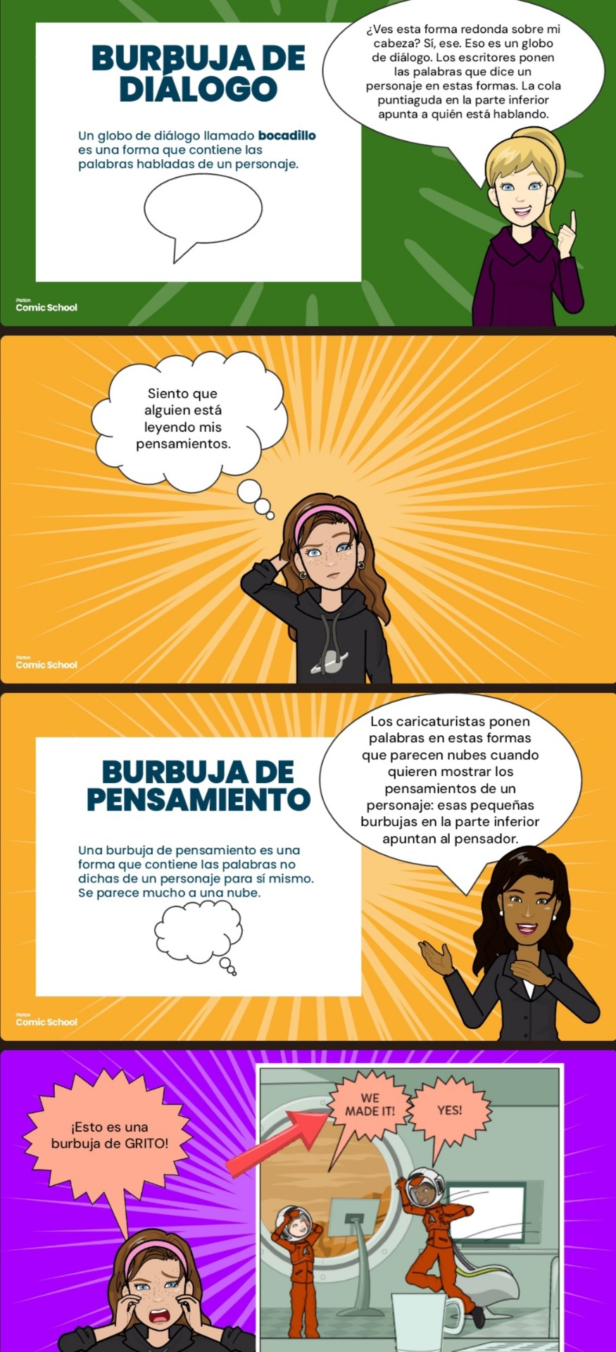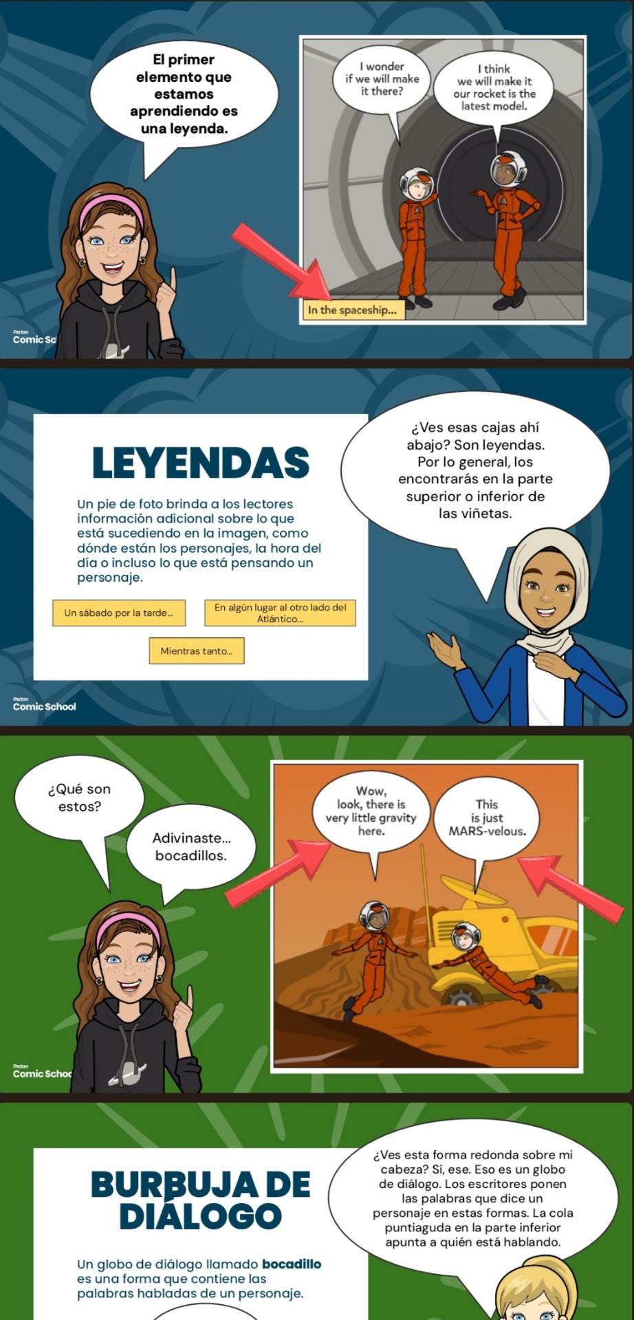 En esta presentación se proyectan herramientas que aportan a la creación de diálogos a utilizar en el cómic, mostrando de forma detallada el correcto uso de los diálogos.